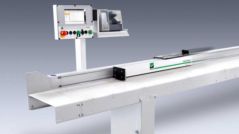 Ako funguje EasyStop – počítačom ovládaná servo zarážka beží po masívnom eloxovanom profile. Ten môžete namontovať na od Dimtra dodané valčekové dráhy, alebo na Váš dopravník. Ku zarážke patrí dotyková obrazovka, cez ktorú navolíte požadovanú dĺžku, ktorú chcete rezať. Dokonca si môžete vytvoriť až 500 rezných listov, pre každý zadať až 350 dĺžok, uložiť ich do pamäte a Vaše dĺžky môžete voliť priamo z tabuľky.