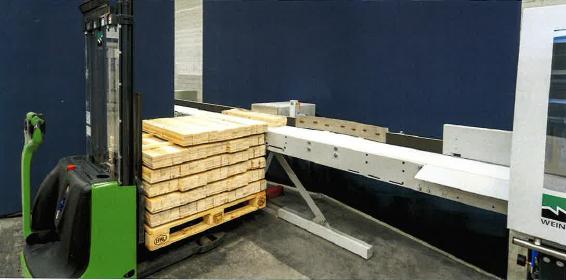 Systém výroby, resp. krátenie paletových prírezov, prebieha najčastejšie na píle s posuvnou zarážkou, ktorú je možné uložiť na pracovný stôl a naraz porezať viacero lamiel na sebe a vedľa seba. Tým sa značne zvyšuje výkon operácie a aj pri základnej píle, ako je OptiCut S 50, je možné dosiahnuť zmenové výkony v desiatkach m3 hotového produktu. Pri tejto výrobe je dôležité redukovať čakacie doby na rezivo na vstupe, resp. na odobratie narezaného tovaru. Nie je zriedkavé, že na jednej píle WEINIG pracujú 2 – 4 operátori.Jedni sa starajú o prísun lamiel, zvyšní ukladajú narezaný tovar na paletu.