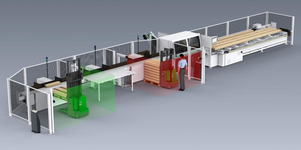 Bezpečnostné vybavenie pre bezpečnú a flexibilnú prevádzku WEINIG DIMTER EuroStacker s bezpečnostným laserovým skenerom.